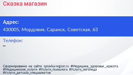 Сказка, магазин по адресу 430005, Мордовия, Саранск, Советская, 63 в дальнейшем Организация, размещена в следующих категориях: