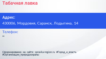 Табачная лавка по адресу 430006, Мордовия, Саранск, Лодыгина, 14 в дальнейшем Организация, размещена в следующих категориях: