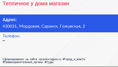 Тепличное у дома, магазин по адресу 430031, Мордовия, Саранск, Гожувская, 2 в дальнейшем Организация, размещена в следующих категориях: