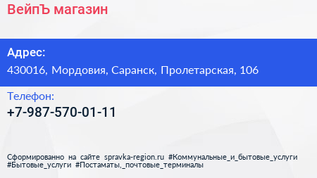 ВейпЪ, магазин по адресу 430016, Мордовия, Саранск, Пролетарская, 106 в дальнейшем Организация, размещена в следующих категориях: