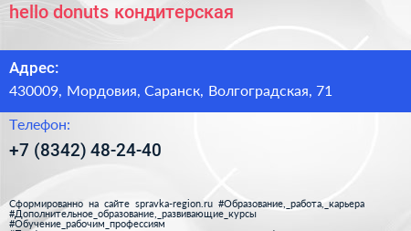 hello donuts, кондитерская по адресу 430009, Мордовия, Саранск, Волгоградская, 71 в дальнейшем Организация, размещена в следующих категориях: