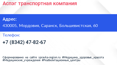 Аспэг, транспортная компания по адресу 430005, Мордовия, Саранск, Большевистская, 60 в дальнейшем Организация, размещена в следующих категориях: