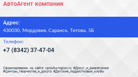 АвтоАгент, компания по адресу 430030, Мордовия, Саранск, Титова, 5Б в дальнейшем Организация, размещена в следующих категориях: