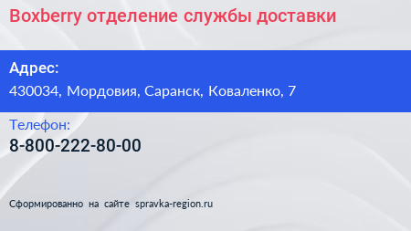Boxberry, отделение службы доставки по адресу 430034, Мордовия, Саранск, Коваленко, 7 в дальнейшем Организация, размещена в следующих категориях: