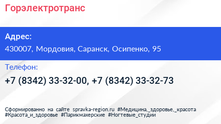 Горэлектротранс по адресу 430007, Мордовия, Саранск, Осипенко, 95 в дальнейшем Организация, размещена в следующих категориях: