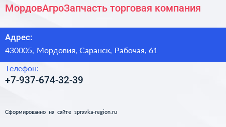 МордовАгроЗапчасть, торговая компания по адресу 430005, Мордовия, Саранск, Рабочая, 61 в дальнейшем Организация, размещена в следующих категориях: