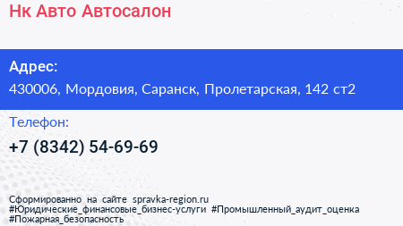 Нк-Авто, Автосалон по адресу 430006, Мордовия, Саранск, Пролетарская, 142 ст2 в дальнейшем Организация, размещена в следующих категориях: