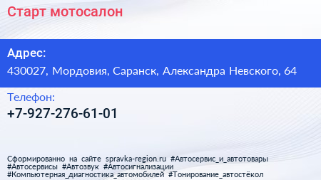 Старт, мотосалон по адресу 430027, Мордовия, Саранск, Александра Невского, 64 в дальнейшем Организация, размещена в следующих категориях: