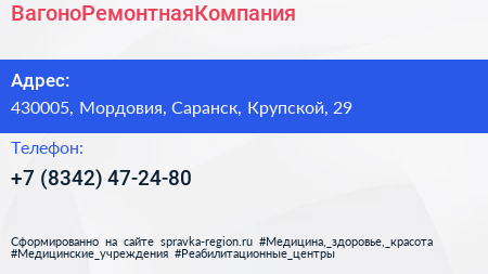 ВагоноРемонтнаяКомпания по адресу 430005, Мордовия, Саранск, Крупской, 29 в дальнейшем Организация, размещена в следующих категориях: