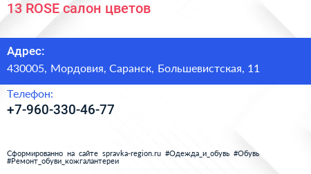 13 ROSE, салон цветов по адресу 430005, Мордовия, Саранск, Большевистская, 11 в дальнейшем Организация, размещена в следующих категориях: