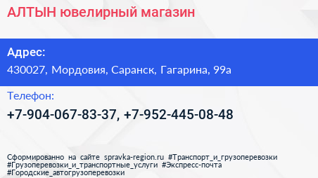 АЛТЫН, ювелирный магазин по адресу 430027, Мордовия, Саранск, Гагарина, 99а в дальнейшем Организация, размещена в следующих категориях: