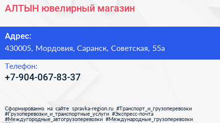 АЛТЫН, ювелирный магазин по адресу 430005, Мордовия, Саранск, Советская, 55а в дальнейшем Организация, размещена в следующих категориях: