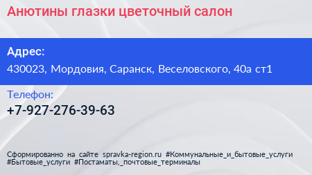Анютины глазки, цветочный салон по адресу 430023, Мордовия, Саранск, Веселовского, 40а ст1 в дальнейшем Организация, размещена в следующих категориях: