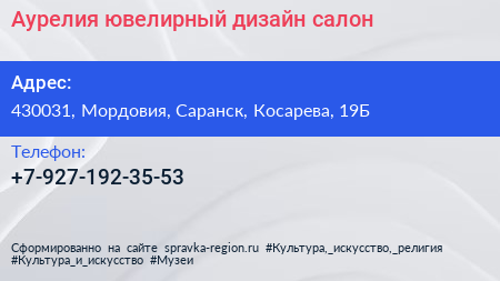 Аурелия, ювелирный дизайн-салон по адресу 430031, Мордовия, Саранск, Косарева, 19Б в дальнейшем Организация, размещена в следующих категориях: