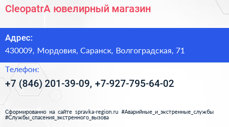 CleopatrA, ювелирный магазин по адресу 430009, Мордовия, Саранск, Волгоградская, 71 в дальнейшем Организация, размещена в следующих категориях: