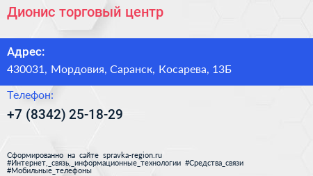 Дионис, торговый центр по адресу 430031, Мордовия, Саранск, Косарева, 13Б в дальнейшем Организация, размещена в следующих категориях: