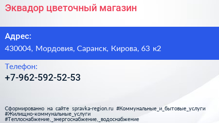 Эквадор, цветочный магазин по адресу 430004, Мордовия, Саранск, Кирова, 63 к2 в дальнейшем Организация, размещена в следующих категориях: