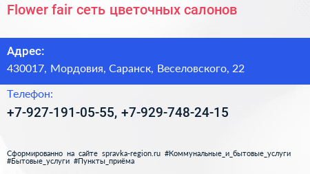 Flower fair, сеть цветочных салонов по адресу 430017, Мордовия, Саранск, Веселовского, 22 в дальнейшем Организация, размещена в следующих категориях: