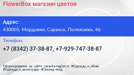 FlowerBox, магазин цветов по адресу 430005, Мордовия, Саранск, Полежаева, 46 в дальнейшем Организация, размещена в следующих категориях: