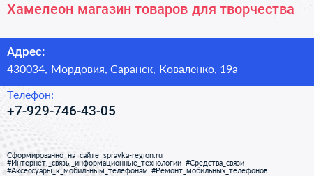 Хамелеон, магазин товаров для творчества по адресу 430034, Мордовия, Саранск, Коваленко, 19а в дальнейшем Организация, размещена в следующих категориях: