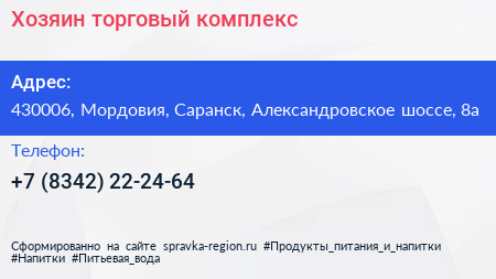 Хозяин, торговый комплекс по адресу 430006, Мордовия, Саранск, Александровское шоссе, 8а в дальнейшем Организация, размещена в следующих категориях: