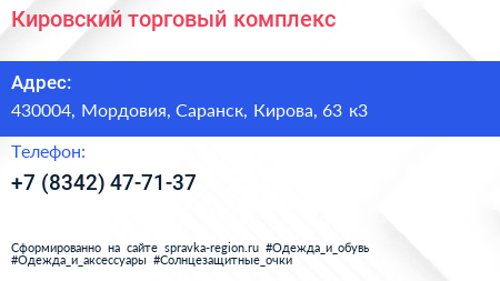 Кировский, торговый комплекс по адресу 430004, Мордовия, Саранск, Кирова, 63 к3 в дальнейшем Организация, размещена в следующих категориях: