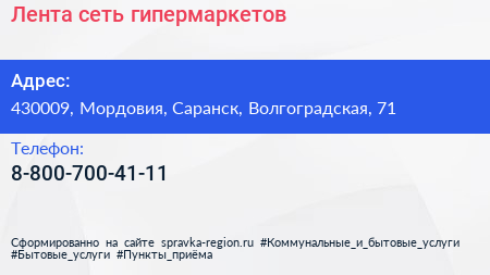 Лента, сеть гипермаркетов по адресу 430009, Мордовия, Саранск, Волгоградская, 71 в дальнейшем Организация, размещена в следующих категориях: