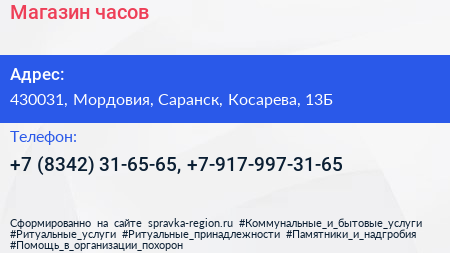 Магазин часов по адресу 430031, Мордовия, Саранск, Косарева, 13Б в дальнейшем Организация, размещена в следующих категориях: