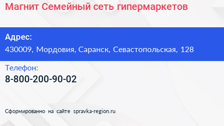Магнит Семейный, сеть гипермаркетов по адресу 430009, Мордовия, Саранск, Севастопольская, 128 в дальнейшем Организация, размещена в следующих категориях: