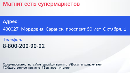 Магнит, сеть супермаркетов по адресу 430027, Мордовия, Саранск, проспект 50 лет Октября, 1 в дальнейшем Организация, размещена в следующих категориях: