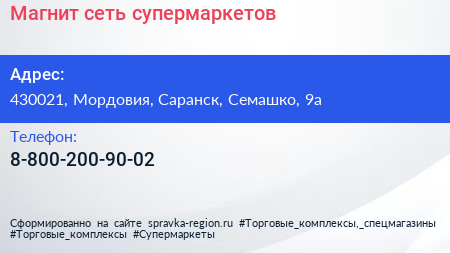 Магнит, сеть супермаркетов по адресу 430021, Мордовия, Саранск, Семашко, 9а в дальнейшем Организация, размещена в следующих категориях: