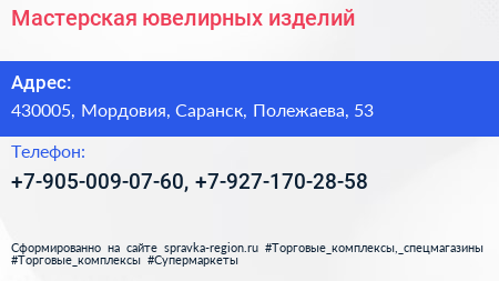 Мастерская ювелирных изделий по адресу 430005, Мордовия, Саранск, Полежаева, 53 в дальнейшем Организация, размещена в следующих категориях: