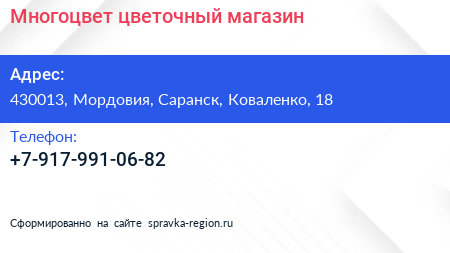 Многоцвет, цветочный магазин по адресу 430013, Мордовия, Саранск, Коваленко, 18 в дальнейшем Организация, размещена в следующих категориях: