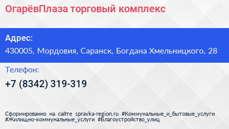ОгарёвПлаза, торговый комплекс по адресу 430005, Мордовия, Саранск, Богдана Хмельницкого, 28 в дальнейшем Организация, размещена в следующих категориях: