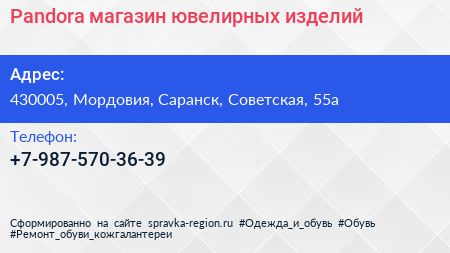 Pandora, магазин ювелирных изделий по адресу 430005, Мордовия, Саранск, Советская, 55а в дальнейшем Организация, размещена в следующих категориях: