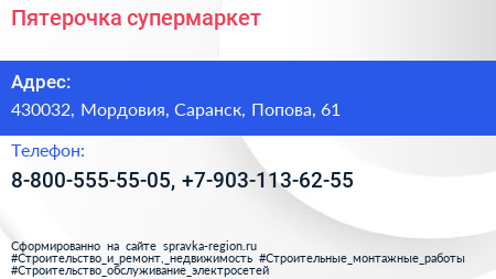 Пятерочка, супермаркет по адресу 430032, Мордовия, Саранск, Попова, 61 в дальнейшем Организация, размещена в следующих категориях: