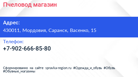 Пчеловод, магазин по адресу 430011, Мордовия, Саранск, Васенко, 15 в дальнейшем Организация, размещена в следующих категориях:
