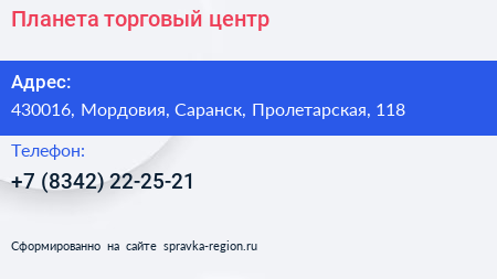 Планета, торговый центр по адресу 430016, Мордовия, Саранск, Пролетарская, 118 в дальнейшем Организация, размещена в следующих категориях: