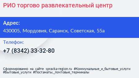 РИО, торгово-развлекательный центр по адресу 430005, Мордовия, Саранск, Советская, 55а в дальнейшем Организация, размещена в следующих категориях: