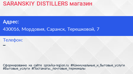 SARANSKIY DISTILLERS, магазин по адресу 430016, Мордовия, Саранск, Терешковой, 7 в дальнейшем Организация, размещена в следующих категориях: