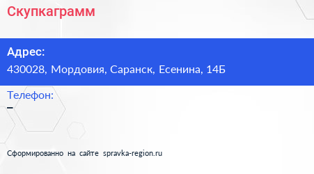 Скупкаграмм по адресу 430028, Мордовия, Саранск, Есенина, 14Б в дальнейшем Организация, размещена в следующих категориях: