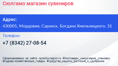 Сюлгамо, магазин сувениров по адресу 430005, Мордовия, Саранск, Богдана Хмельницкого, 31 в дальнейшем Организация, размещена в следующих категориях: