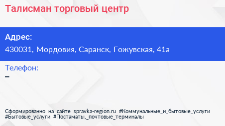 Талисман, торговый центр по адресу 430031, Мордовия, Саранск, Гожувская, 41а в дальнейшем Организация, размещена в следующих категориях: