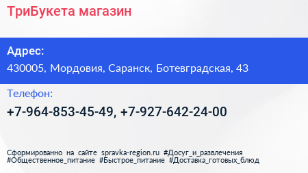 ТриБукета, магазин по адресу 430005, Мордовия, Саранск, Ботевградская, 43 в дальнейшем Организация, размещена в следующих категориях: