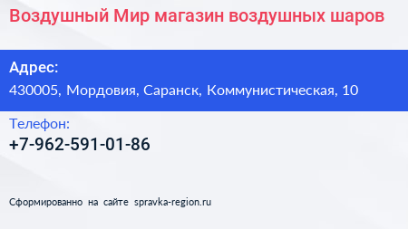 Воздушный Мир, магазин воздушных шаров по адресу 430005, Мордовия, Саранск, Коммунистическая, 10 в дальнейшем Организация, размещена в следующих категориях: