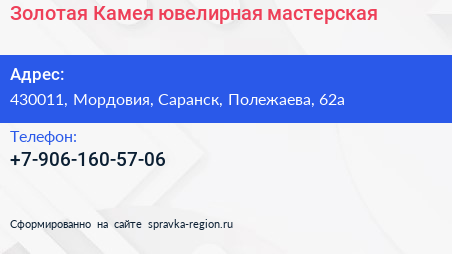 Золотая Камея, ювелирная мастерская по адресу 430011, Мордовия, Саранск, Полежаева, 62а в дальнейшем Организация, размещена в следующих категориях: