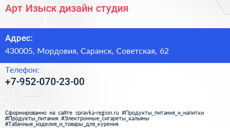 Арт-Изыск, дизайн-студия по адресу 430005, Мордовия, Саранск, Советская, 62 в дальнейшем Организация, размещена в следующих категориях:
