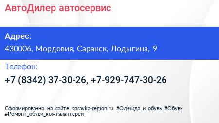 АвтоДилер, автосервис по адресу 430006, Мордовия, Саранск, Лодыгина, 9 в дальнейшем Организация, размещена в следующих категориях: