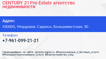 CENTURY 21 Pro Estate, агентство недвижимости по адресу 430005, Мордовия, Саранск, Большевистская, 30 в дальнейшем Организация, размещена в следующих категориях: