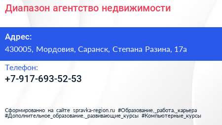Диапазон, агентство недвижимости по адресу 430005, Мордовия, Саранск, Степана Разина, 17а в дальнейшем Организация, размещена в следующих категориях: